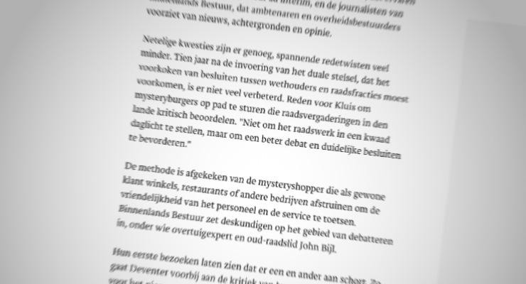 Binnenlands Bestuur test met de Mystery Burger de kwaliteit van het debat in de gemeenteraad. Het vakblad voor politici en ambtenaren zet deskundigen op het gebied van debatteren in, onder wie gemeenteraadkenner en oud-raadslid John Bijl. Trouw pikte de enthousiaste start van de Mystery Burger op.