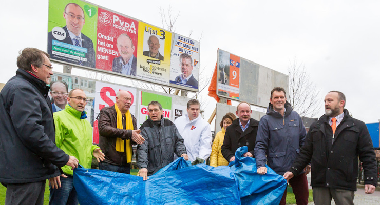 Lijsttrekkers onthullen het eerste verkiezingsbord (Foto: Omroep Flevoland)