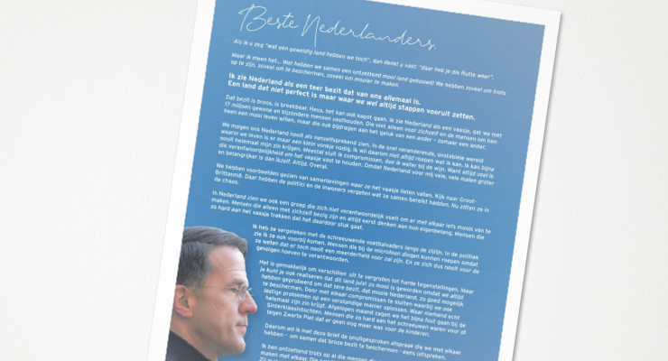 Het is vast niet voor niets dat de brief in het midden laat door welke Mark ze is geschreven. De VVD betaalde voor de plaatsing en het komt de liberalen maar wat goed uit dat de premier hun boodschap verkondigt. Een betrouwbaarder bron dan de regeringsleider kan er toch niet zijn. Daarnaast kan het geen kwaad de kiezers er even aan te herinneren dat Mark Rutte ‘van de VVD’ is; de zogeheten ‘premierbonus’ levert al jaren extra zetels op.